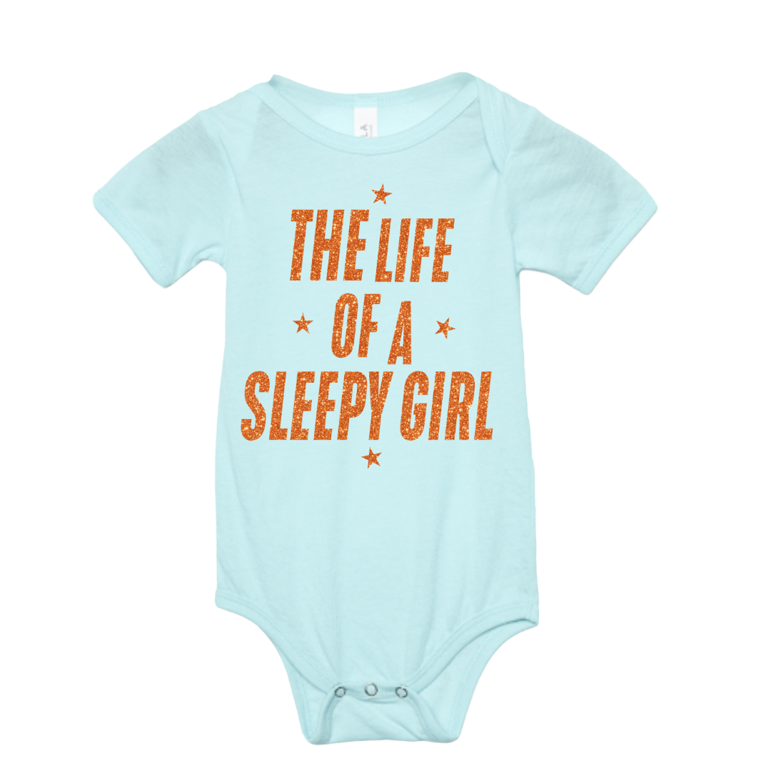 Your little Swiftie-in-training will be the star of nap time in this playful onesie! Inspired by Taylor Swift’s newest era, this baby onesie features the cheeky phrase “The Life of a Sleepygirl” in high quality glitter vinyl which lasts through endless cycles in the washer and dryer.