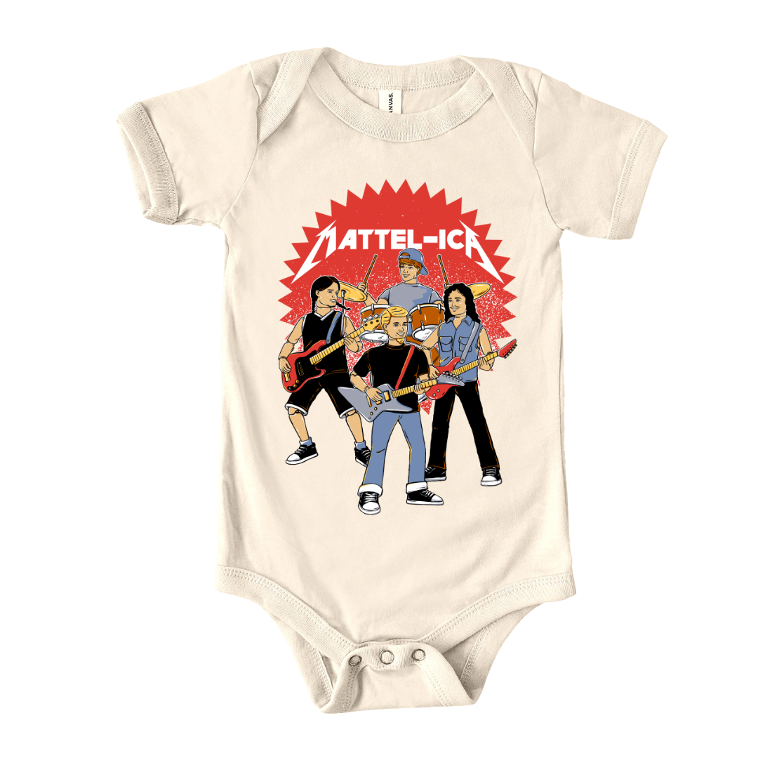 Turn your little one into the ultimate mini rock star with our "Mattel-ica" baby onesie! This isn't just any band tee; it's a rock 'n roll pun masterpiece. Featuring an epic illustration of Ken dolls decked out like the legendary Metallica, this design blends head-banging style with iconic toy vibes. Made from ultra-soft, breathable cotton, it's perfect for keeping your little rocker cozy and cool at all times. Whether they’re jamming out in their crib or catching a nap backstage (aka the car seat), this onesie brings the perfect mix of music and play. Grab one for your tiny metalhead and let the good times roll!