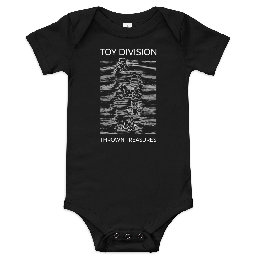 Your baby has lost control again, with their toys... This 100% cotton one piece is perfect for parents (and babies) who are fake fans of Joy Division. It has a three snap leg closure for easy changing, a comfortable envelope neckline, and a very familiar-looking image of the Joy Division "Unknown Pleasures" album cover.